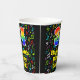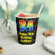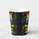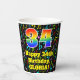 This fun and exciting music-themed birthday paper cup design features a large number “34” with a rainbow spectrum gradient inspired pattern, along with the message “Happy 34th Birthday,”, and a customisable name. The background features a colourful pattern having music notes and symbols of various sizes and colours. Colourful, vibrant paper cups like this might be fun to use at a birthday party being held to honour somebody’s thirty fourth birthday. [~Z0000541]
