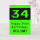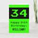 The front of this nerdy and fun birthday themed greeting card design features a large green vintage computer game style number "34". It also features the birthday greeting message "Happy 34th Birthday,", and a custom name. The inside features an editable birthday greeting message, or could perhaps be cleared and left blank if a message is to be written by hand instead. A silly and nerdy birthday greeting card like this might be used to acknowledge the birthday of a scientist, a computing historian, or somebody who appreciates retro computer gaming and who is celebrating their thirty fourth birthday. [~Z0000430]