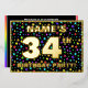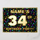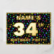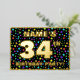 The front of this fun and eye-catching thirty-fourth birthday celebration/party foil invitation card design features a personalised name, a large number “34th”, the message “BIRTHDAY PARTY!”, and a border. The background of the front has a joyful, multicolored star shapes pattern. The back features personalised details about the event, such as the date, time, place, and any other important information. Customised invitations like these might be a fun way to invite guests/attendees to a birthday gathering being held to celebrate somebody’s 34th birthday. [~Z0000600]