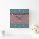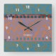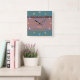 The modern, original graphic design by HomeWare on this Square Wall Clock was made from a scan of a piece of 35mm film. The film strip has become a pattern of muted blues and terracotta, with the part of the strip at the top becoming an iridescent rust colour, with blue highlights. The background colour pattern is made up of muted aqua blues and olive browns. In the centre of the design there is white text which reads "studio". This is set to personalise, use as is, or delete.