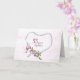 Pink flowers with green ivy bouquet on white satin ribbon heart on pink textured background for 35th wedding anniversary for couple.