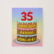 this upbeat and joyful birthday jigsaw puzzle design features a cartoon-style depiction of a three-tier birthday cake having numeral-shaped candles on top showing the number “35“, along with the message “HAPPY 35TH BIRTHDAY,”, and a customisable recipient name. The background features a multi-colour pastel rainbow spectrum inspired gradient pattern. A fun, editable birthday puzzle like this might be used to celebrate somebody’s thirty-fifth birthday. [~Z0000621]