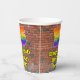 This vibrant and fun urban street art and graffiti inspired birthday paper cup design features a large number “35” having a colourful rainbow spectrum gradient inspired pattern. It also features the message “Happy 35th Birthday,”, and a custom name. The background has a brick wall pattern. Colourful, vibrant paper cups like this might be fun to use at a birthday party being held in celebration of somebody’s thirty fifth birthday. [~Z0000543]