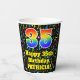 This fun and exciting music themed birthday paper cup design features a large number “35” with a rainbow spectrum gradient inspired pattern, along with the message “Happy 35th Birthday,”, and an editable name. The background features a colourful pattern having music notes and symbols of various colours and sizes. Vibrant, colourful paper cups like this might be fun to use at a birthday party being held in celebration of somebody’s thirty fifth birthday. [~Z0000541]