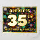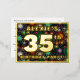 The front of this vibrant and fun thirty-fifth birthday celebration/party foil invitation postcard design features a customisable name, a large number “35th”, the message “BIRTHDAY PARTY!”, and a border. The background of the front features a bold, colourful pattern inspired by bursting celebratory fireworks. The back features personalised details about the event, such as the date, time, place/venue, and any other relevant information. Customised invitations like these might be a fun way to let attendees/guests know about a birthday gathering being held in celebration of somebody’s 35th birthday. [~Z0000609]