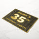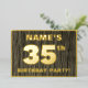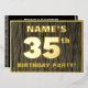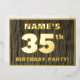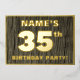 The front of this bold thirty-fifth birthday party/celebration foil invitation card features a custom name, a large number “35th”, the message “BIRTHDAY PARTY!”, and a border, all in foil. There is a rustic, yet elegant, faux wood grain look inspired pattern for the background of the front. The back features personalised details about the event, such as the date, time, venue/place, and any other information that may be useful. Personalised invitations like these might be used to invite guests/attendees to a birthday party being held to honour somebody’s 35th birthday. [~Z0000598]