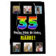 This upbeat and joyful birthday-themed gift bag design features a large number “35“ having a multicolor rainbow spectrum inspired gradient pattern, along with the message “Happy 35th Birthday,“ and a customisable recipient name. The photos above and below the message can be personalised, perhaps with photos of the recipient, the recipient’s family and friends, and/or the sender(s) of the gift. A cheerful gift bag like this might be used when giving a present in honour of somebody’s thirty-fifth birthday. (Photography © Storytree Studios, Stanford, CA.) [~Z0000669]