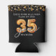35th Class Reunion Black Orange Balloons Confetti Can Cooler. Personalised modern, festive commemorative keepsake can coozies featuring large faux metallic orange balloon numbers, orange streamers and confetti and white lights and script typography with your school name and class in year on black. ASSISTANCE: For help with design modification or personalisation, other balloon number for another year, colour change, transferring the design to another product or if you would like coordinating items, contact the designer BEFORE ORDERING via the Zazzle Chat MESSAGE tab below or email makeitaboutyoustore@gmail.com.
