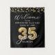 35th Class Reunion Welcome Black Gold Balloon Numbers Sign. Welcome high school or university college alumni to your 35 Year Class Reunion with this personalised modern, festive welcome sign featuring large faux metallic gold balloon numbers, gold streamers and confetti and white lights personalised with your school name and class year in your choice of background colour (shown in black) you can change to your school colour. ASSISTANCE: For help with design modification or personalisation, other balloon number for another year, colour change, transferring the design to another product or if you would like coordinating items, contact the designer BEFORE ORDERING via the Zazzle Chat MESSAGE tab below or email makeitaboutyoustore@gmail.com.