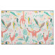 This seamless pattern feature playful jungle animals in pastel colours. We can see several monkey orangutans in coral orange, eating bananas, next to toucans, cockatoo, snakes and sloth. All surrounded with bright tropical leaves in green, pink, yellow and orange tones.