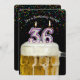 Number 36 birthday candles in mug of beer with colourful confetti on black for 36th birthday party invite.