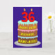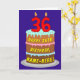 This cheerful and joyful birthday-themed greeting card design features a depiction of a three-tier birthday cake having numeral-shaped candles on top showing the number “36“, along with the message “HAPPY 36TH BIRTHDAY,”, and a personalised recipient name. The inside has a customisable birthday greeting message, or could perhaps be cleared and left blank if a message is to be written by hand instead. An upbeat, editable birthday greeting card like this might be sent in celebration of somebody’s thirty-sixth birthday. [~Z0000620]