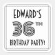 This stylish and 1920s/1930s style inspired thirty-sixth birthday party/celebration square sticker design features a custom name, an intricate art deco style inspired number “36th”, the message “BIRTHDAY PARTY!”, and a border pattern consisting of lines. Stylish birthday themed stickers like these might be used or distributed at a birthday party in celebration of somebody’s 36th birthday, or perhaps used when preparing invitations or presents/gifts for such an event. [~Z0000618]