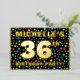 The front of this exciting and upbeat thirty-sixth birthday celebration/party foil invitation card design features a personalised name, a large number “36th”, the message “BIRTHDAY PARTY!”, and a border. The background of the front features a vibrant, multicolored starfield pattern. The back features personalised details about the event, such as the date, time, venue, and any other relevant information. Personalised invitations like these might be a fun way to invite guests to a birthday party/gathering being held to celebrate somebody’s 36th birthday. [~Z0000600]