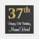 This elegant, luxurious, and sophisticated birthday paper napkin design features a large ordinal number “37th” having a faux/imitation gold-like gradient pattern, in addition to the birthday greeting message “Happy 37th Birthday,” and an editable name in a script-style font. The background is coloured black. Paper napkins like this might be used at a birthday party held in celebration of somebody’s thirty seventh birthday. [~Z0000516]