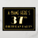 The front of this 1920s-1930s style inspired and vintage-look thirty-seventh birthday party foil invitation features a personalised name, a large art deco look inspired number “37th”, the message “BIRTHDAY PARTY”, and a border pattern consisting of lines. The front also features a black-coloured background by default, but it can be customised to a different colour if desired. The back features personalised details about the event, such as the date, time, venue, and any other important information. Luxurious, elegant, personalised invitations like these might be used to invite guests to a birthday gathering/party being held in celebration of somebody’s 37th birthday. [~Z0000591]