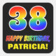 This fun, colourful, and cheerful birthday-themed sticker design features a large number "38" and the message "HAPPY BIRTHDAY,", both having a rainbow spectrum gradient inspired pattern colouring, along with a bold yellow personalised name. The background is coloured black. Fun stickers this might be used when wrapping a gift or present in honour of somebody’s 38th birthday, or perhaps may be handed out to the attendees at a birthday celebration. [~Z0000480]