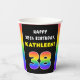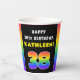 This upbeat and cheerful birthday themed paper cup design features the number “38“ with a colourful rainbow spectrum inspired gradient pattern, along with the message “HAPPY 38th BIRTHDAY,”, and a personalised recipient name. Joyful paper cups like this might be fun to use at a party in honour of somebody’s 38th birthday. [~Z0000639]