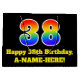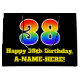 This vibrant and colourful birthday-themed gift-bag design features a large number "38" having a rainbow spectrum gradient inspired pattern. It also features the message "Happy 38th Birthday,", and a customisable name. It also has a black-coloured background. A gift bag like this might be a fun way of wrapping a birthday present or gift being given to somebody who is celebrating their 38th birthday. [~Z0000521]