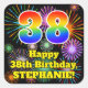 This joyful and cheerful birthday-themed square sticker design features a large number “38” having a colourful rainbow spectrum gradient inspired pattern. It also features the message “Happy 38th Birthday,”, and an editable name. The background features an exciting and colourful pattern inspired by the appearance of bursting celebratory fireworks. Vibrant, fun, personalised stickers like this might be given as a birthday gift, or used while wrapping presents/gifts, or perhaps used as a birthday party decoration when celebrating somebody’s thirty eighth birthday. [~Z0000579]