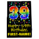 This fun, exciting, and vibrant birthday-themed gift bag design features a large number "39" with a rainbow spectrum gradient style pattern, along with the message "Happy 39th Birthday,", and a custom recipient name. It also has a colourful background pattern featuring star shapes of various sizes. A birthday themed giftbag like this might be a fun way to wrap a gift or present being given to celebrate somebody’s 39th birthday. [~Z0000510]