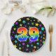 This cheerful, colourful, and fun paper plate design features a large number "39" containing a rainbow spectrum gradient inspired pattern. The background features a colourful pattern of star shapes. Fun paper plates like this might be used at a party being held to celebrate somebody’s thirty ninth birthday, or a couple’s thirty ninth anniversary, or some other 39th event. [~Z0000493]