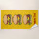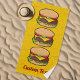 Cheeseburger icon. Junk food outline icons yellow pattern background. Custom text.