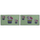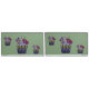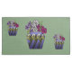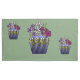 A trio of IconDoIt's original "Arts and Crafts" style inspired design of a calla lily emblazoned cornflower blue vase filled with a mixed floral bouquet of violet pansies and daisies set against a celadon green raw silk look background.