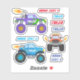 Three cool monster trucks in various colours for kids with flames and personalised blue, red and white names with 3 extra text lines.