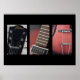 3 Part Harmony is a triptych featuring three close up colour photographic images of different components of an old Framus hollow body electric jazz guitar. The first frame features the black headstock and machine heads where the strings can be tightened and tuned. The Framus logo is also in this image. The second frame shows a of the magnetic pickup which is black with a white metal framing it. Part of the guitar neck is visible which is a dark brown and some of the frets are also visible as is a bit of the black and red finish on the body of the guitar. The third and final frame shows a closeup of the black and white bridge of the guitar as well as the tailpiece. The lower bout of the guitar body is visible and finished in a bright vibrant red. One of the F-holes is also shown in the upper left hand corner of the frame. This image would make a great gift for and music lover. Especially if they love blues, jazz of rock and roll.