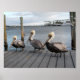 A picture of three pelicans standing in a row on a boat dock in Panama City Beach, Florida.