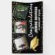 A graduation banner which allows you to upload 3 pictures of the graduate, gold sparkle decoration on a black background, gold graduation cap and a modern template that is easy to customise.
