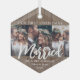 Celebrate a joyful 1st holiday as Mr. & Mrs. with a custom 3 photo collage "Our First Christmas Married" faux wood glass hexagon ornament. All wording and pictures on this template are simple to personalise. If preferred, the script typography can read "Together" or "Engaged." (IMAGE DESIGN TIP: An easy way to centre a photo exactly how you want is crop it before uploading to the Zazzle website.) The modern farmhouse design features rustic brown faux wood, handwritten style script calligraphy, typewriter typography names & year, and three pictures of your choice. This unique & modern keepsake adds a stylish touch to Xmas home decorations. Makes a cute wedding gift idea for the bride and groom.