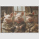 The suited up business trio of pig characters who bring warmth and cosiness to any room they grace. Dressed in their human-like attire, they lounge on a patterned couch that’s as inviting as their charming company. The middle pig, with its red and white striped shirt and suspenders, exudes a playful vibe, while the siblings on either side, decked out in jackets and hats, add a touch of sophistication. Their vintage living room setting, complete with framed pictures and a sense of nostalgia, is the perfect backdrop for their endearing antics.