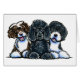 Drawing of three colours of Portuguese Water Dogs: black, black white parti, and brown white parti. Art by Andie.