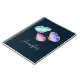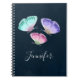 A personalised notebook with a pretty design. 3 watercolor butterflies, painted pink, purple and green. Dark blue watercolor background.