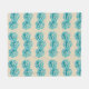 A blanket with a repeating pattern illustrated with a simple trio of teal roses painted with watercolors. Set on a tan coloured backdrop.