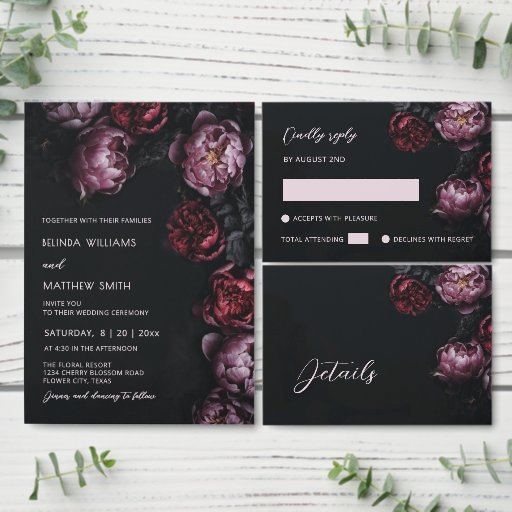 3D Purple and Dark Red Peony Wedding Menu