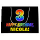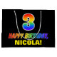 This cheerful, colourful, and fun birthday themed gift bag design features a large number "3" and the message "HAPPY BIRTHDAY,", both coloured with a rainbow spectrum gradient inspired pattern, along with a bold yellow personalised recipient name. The background is coloured black. A fun birthday themed gift bag like this might be used when giving a gift or present in celebration of somebody’s 3rd birthday. [~Z0000477]