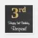 This stylish, elegant, and sophisticated birthday paper napkin design features a large ordinal number “3rd” having an imitation/faux gold-like look, in addition to the birthday greeting message “Happy 3rd Birthday,” and an editable name in a script-style font. The background is coloured black. Luxurious paper napkins like this might be fun to use at a birthday party in honour of somebody’s 3rd birthday. [~Z0000516]