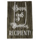 This ornate and luxurious birthday themed gift bag design features the message “Happy 3rd Birthday,” in elaborate script style text, on a faux wood look inspired pattern background. It also features an editable recipient name. A birthday themed giftbag like this might be a respectable way to wrap a gift or present being given to celebrate somebody’s 3rd birthday. [~Z0000558]