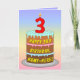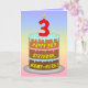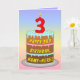 This joyful and colourful birthday greeting card design features a cartoon-style depiction of a three-tier birthday cake having a numeral-shaped candle on top showing the number “3“, along with the message “HAPPY 3RD BIRTHDAY,”, and a customisable recipient name. The background of the front has a multi-colour pastel rainbow spectrum inspired gradient pattern. The inside features a custom birthday greeting message, or could perhaps be cleared and left blank if a message is to be written by hand instead. A fun, personalised birthday greeting card like this might be a fun way to send some birthday wishes to somebody who is celebrating their third birthday. [~Z0000625]