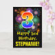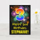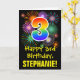 The front of this colorful, fun, and exciting birthday themed greeting card design features a large number "3" having a rainbow spectrum gradient inspired pattern. It also features the message "Happy 3rd Birthday,", and a custom recipient name. The front additionally has a colorful background pattern inspired by the appearance of bursting celebratory fireworks. The inside features an editable birthday greeting message, or could perhaps be cleared and left blank if a message is to be written by hand instead. A personalized birthday card like this might be a fun way to acknowledge somebody’s third birthday. [~Z0000442]