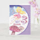For a little girl age 3. This sweet birthday card features a pretty little fairy in a pink dress flying over two decorative mushrooms. She has long yellow hair and is carrying a tiny star. In the background are fluffy white clouds, and on her right side is a border of tiny white daisies on a lilac background.
