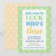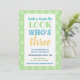 Beautiful blue green yellow, pastel tones, with clover pattern , pleasent and complimentary colours. Great design for birthday invitation and clever 3rd birthday wording.