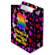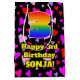 This joyful and fun birthday giftbag design features a large number “3” with a rainbow spectrum gradient inspired pattern, along with the message “Happy 3rd Birthday,”, and an editable name. The background features a pattern of red, purple, and pink heart shapes. A loving gift bag like this might be used when giving a gift or present in honour of somebody’s 3rd birthday. [~Z0000551]