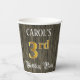 This luxurious and ornate birthday themed paper cup design features an editable name and the message “3rd Birthday Party”. The large number “3rd” has an imitation/faux gold-inspired colouring pattern, the words “Birthday Party” are in opulent script-style text, and the background features an imitation/faux woodgrain-inspired pattern. Fancy, elegant paper cups like this might be useful to have at a birthday party being held in celebration of somebody’s 3rd birthday. [~Z0000568]