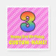 This cheerful and festive 3rd birthday themed paper napkin design features a large number "3" having a colourful pattern inspired by the appearance of a rainbow spectrum. It also features the message "Happy 3rd Birthday,", and a custom name. The background features a cheerful pattern of light pink and dark pink stripes containing loving pink heart shapes. Birthday themed paper napkins like this might be used when celebrating somebody’s third birthday. [~Z0000417]