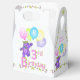 3rd birthday party custom name gable favour box featuring a cuddly and cute purple teddy bear princess dressed up in a lovely yellow jewelled crown and pink, blue and green flower accessories holding a bunch of balloons with the word PARTY on them. Personalising with child's name makes it extra special. It's a fun royal theme for a special princess. Original design by Anura Design Studio.