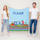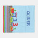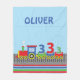Our colourful 3rd birthday blanket showcases a delightful train carrying three number threes! Personalise with the name of the young boy. The background is set in a sky blue. Perfect gift for the boy to cosy up to on his bed or while watching TV. Colourful stripes at the bottom, reflect the bright, fun colours of the train.